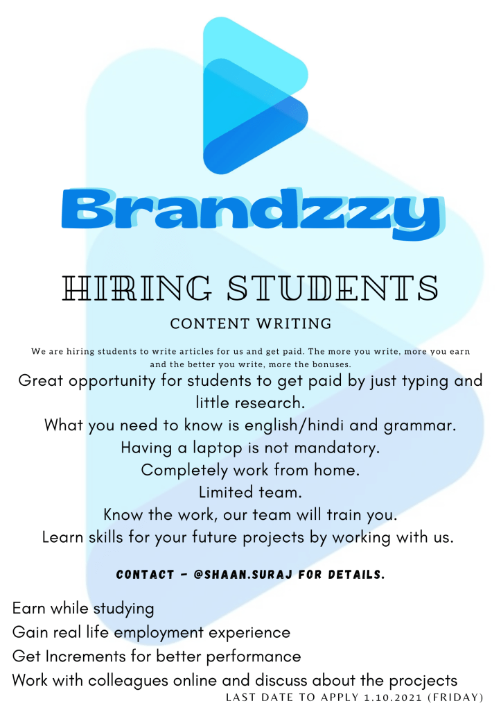 Hey folks, Brandzzy is hiring students and is paying them handsomely for writing articles. Application Open till 1.10.2021. Follow me on instagram to know more